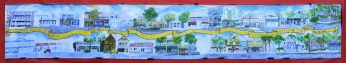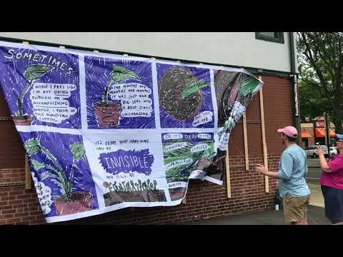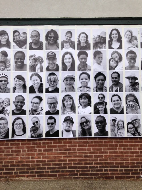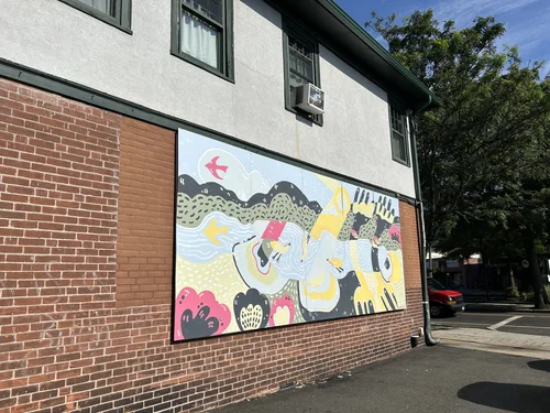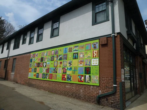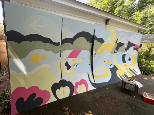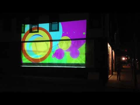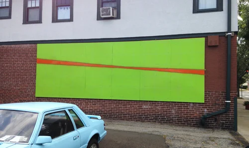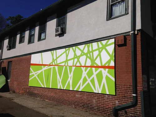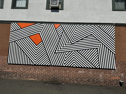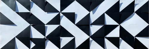 Albers’s work was fixed in two dimensions. Sun exposure on EastWallWestVille offered an opportunity to animate and extend a simple Froebel-inspired Albers geometry to a third dimension by lifting a corner of each of the triangular elements. At the sun’s most direct angle to the wall, the black triangles retain their geometric purity and the piece appears 2-D; but as the sun transits the sky the lifted corners of the triangles create shadows, increasingly warping and abstracting the geometry as the sun angle becomes more acute.
